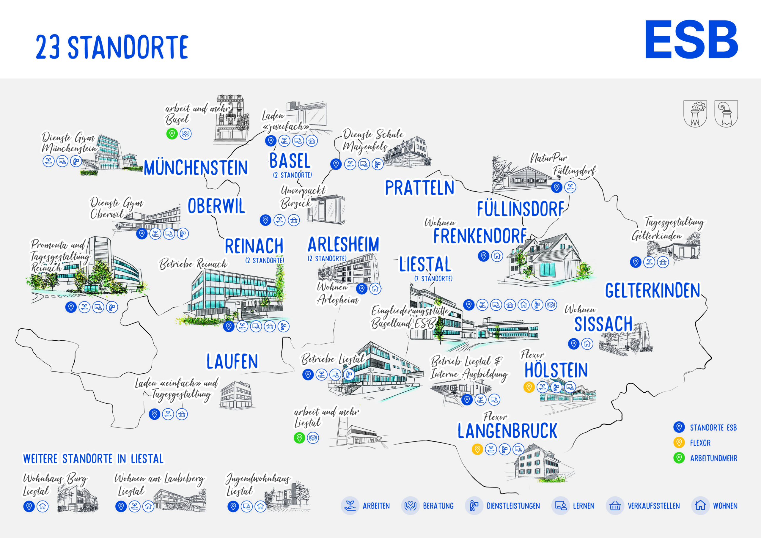 Vo Schönebuech bis Ammel. Die ESB ist an dreiundzwanzig Standorten für Sie da. Gesamthaft bieten wir gegenwärtig rund 110 Wohn- und 480 Arbeitsplätze, sowie Schul- und Lernmöglichkeiten in verschiedenen Bereichen.